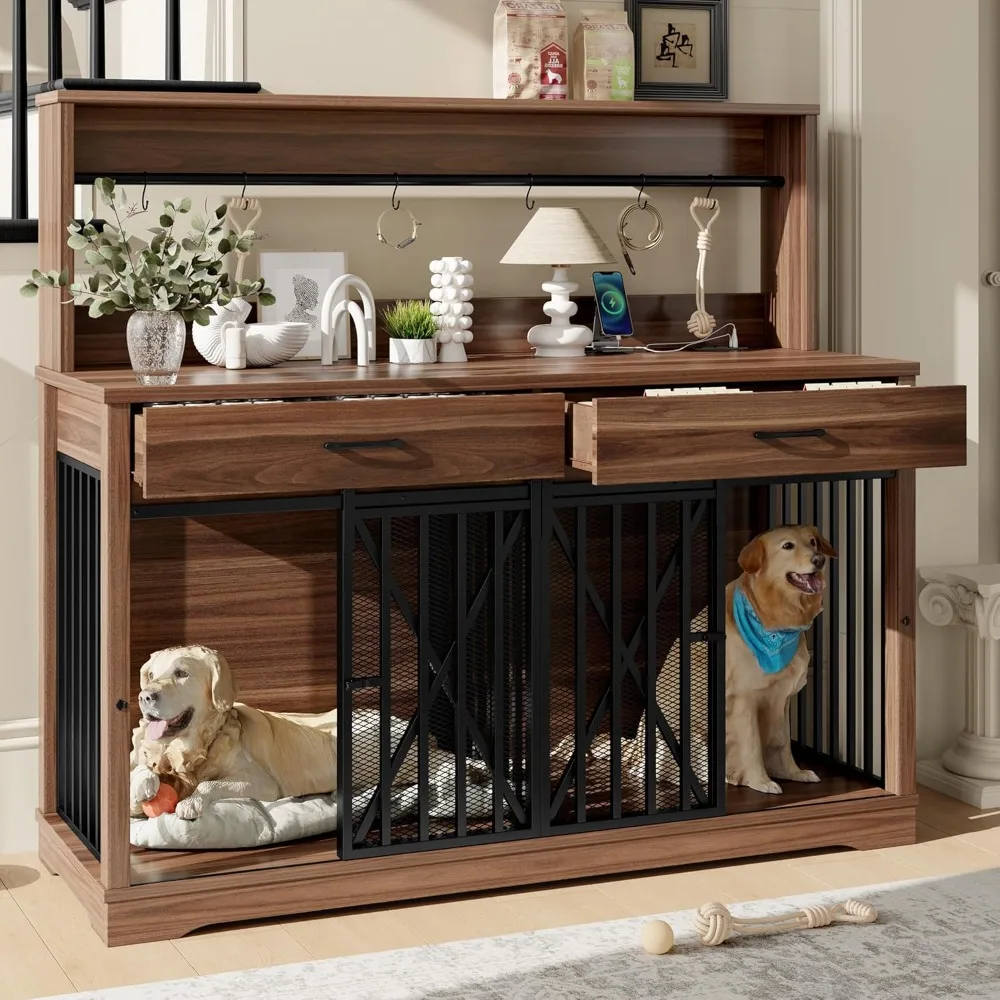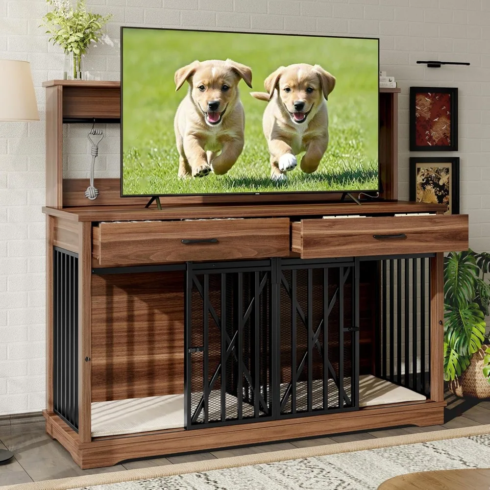 55.1" Dog Crate Furniture Heavy Duty Dog Cage with 2 Storage Drawers and Shelves TV Stand Side End Table Divider Locks