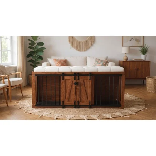 56 inch long, furniture style 2-in-1 dog box with cushioned seats, sliding barn door, luxurious wooden dog house, walnut wood