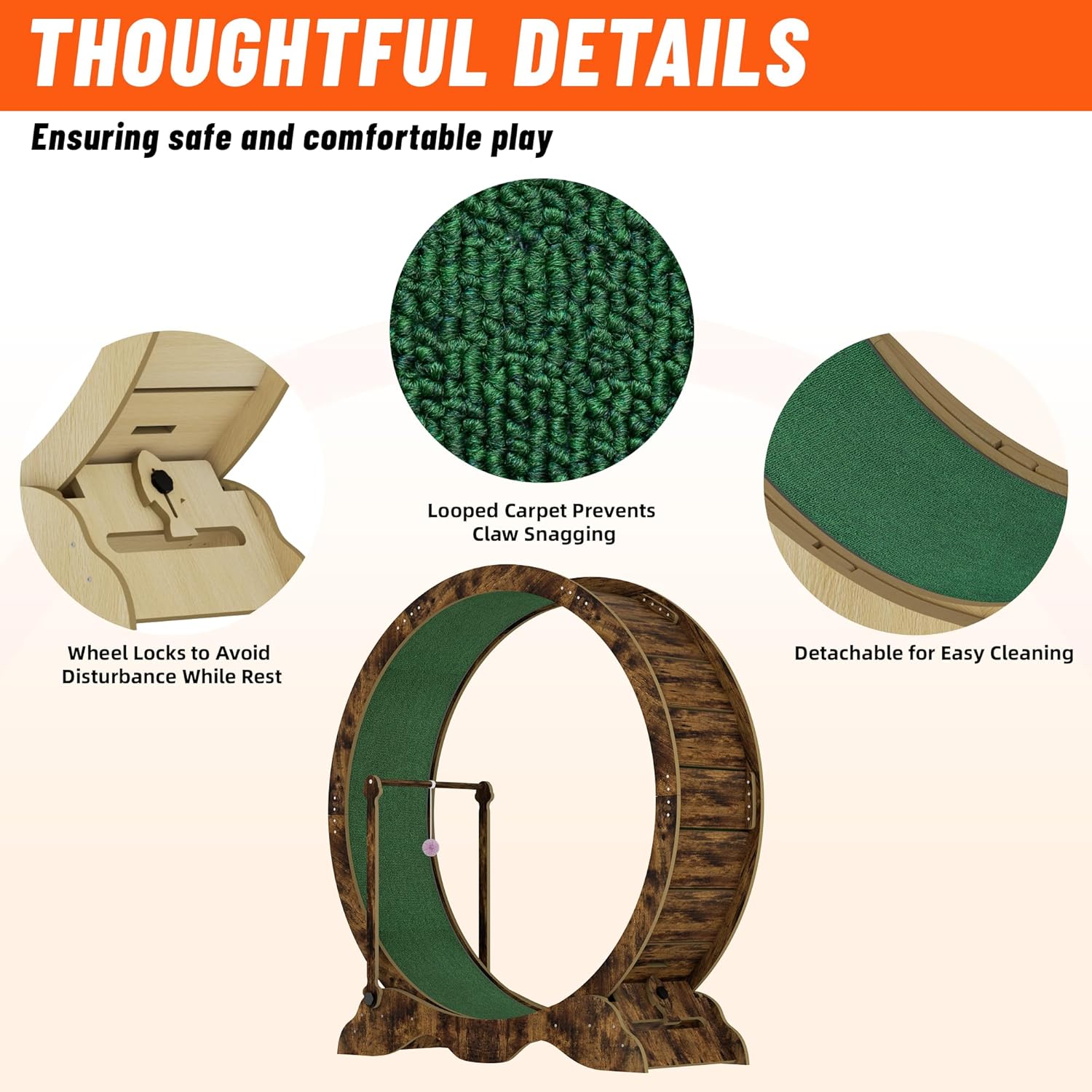 【Rock-Solid Stability & Claw-Safe Design】:Built with 9-layer solid plywood and a waterproof melamine UV-coating, this wheel offers unparalleled stability with zero wobble, even when your heaviest cat sprints. The seamless design and removable, soft carpeted track are claw-friendly, preventing snags and injuries. The track is securely attached with strong Velcro, making it non-slip, comfortable, and easy to clean or replace.