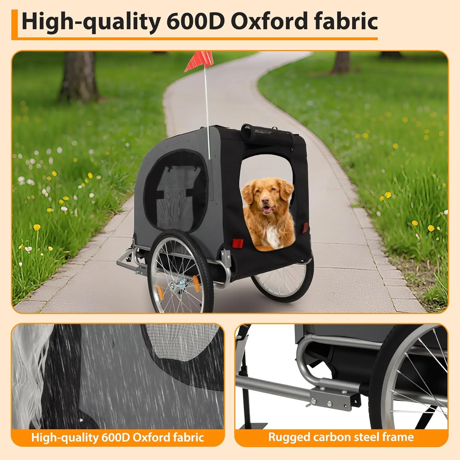 【Safe, Sturdy Ride for Your Furry Friend】Give your pet the comfort they deserve with this premium bike dog trailer! Built from a tough carbon steel frame and durable 600D Oxford fabric, it keeps pets up to 88 lbs secure on every adventure. The padded interior softens shocks, while the semi-open design lets them enjoy fresh air and scenery without risk. Perfect for daily rides or weekend trails—your pup will love the safe, cozy journey!