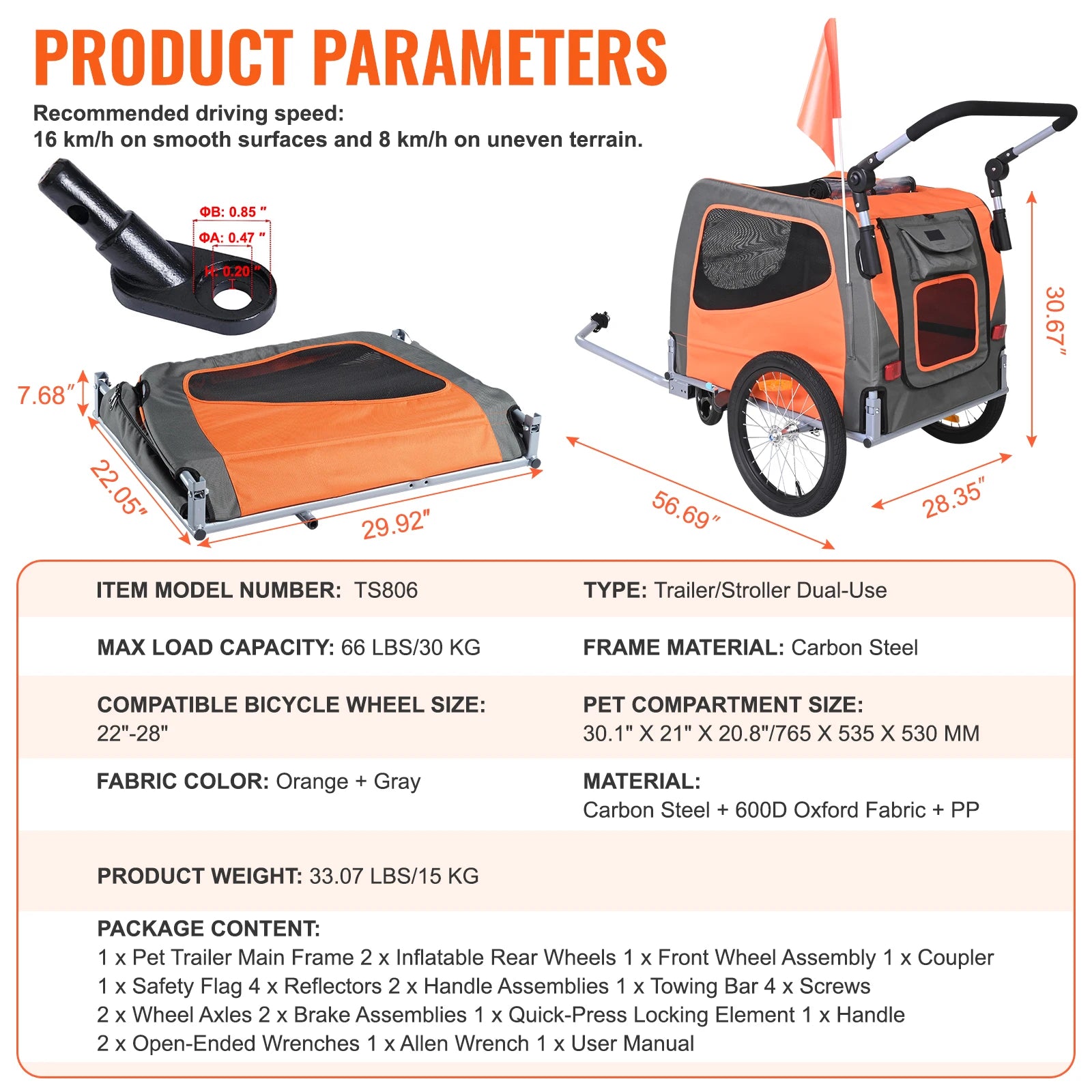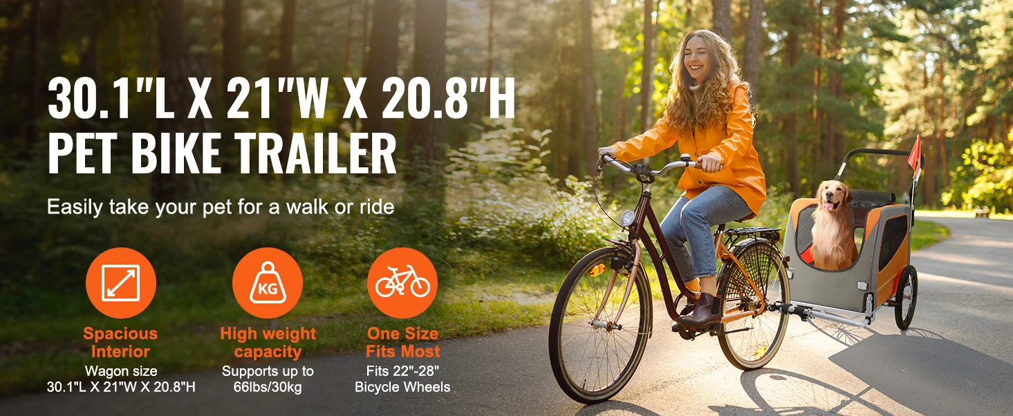 2-in-1 Design: This dog bike trailer is your perfect partner for leisurely bike rides. It easily transforms from a bicycle trailer to a stroller. It fits most bicycles with wheel diameters of 22-28 inches and can carry up to 66 lbs/30 kg, making it effortless to take your furry companion on adventures.