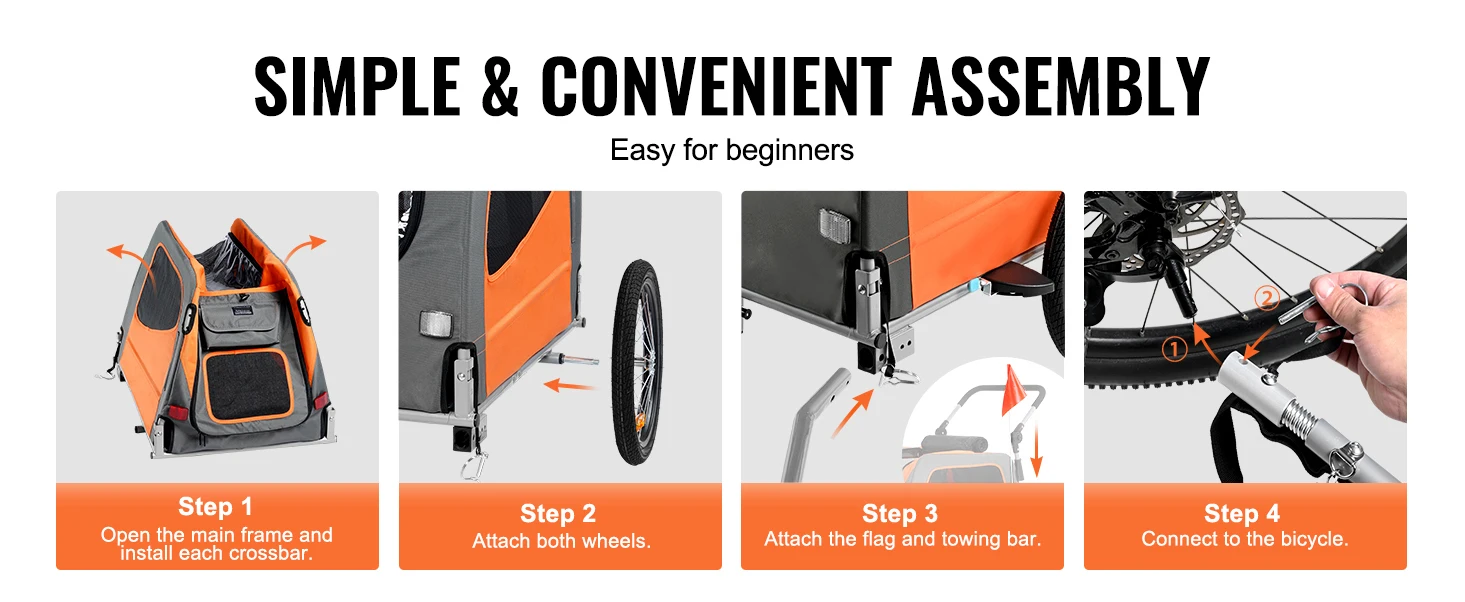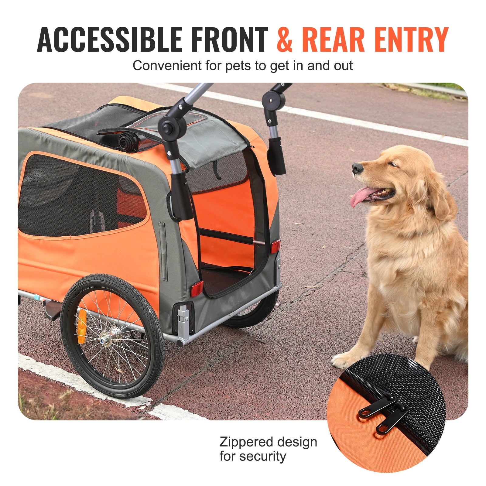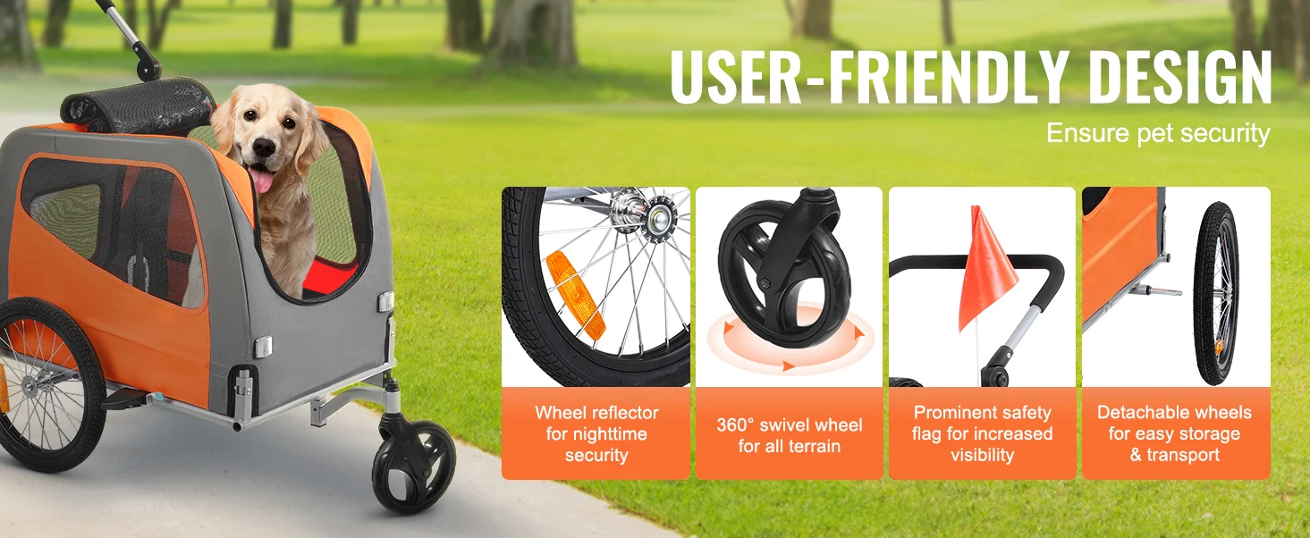 Easy In, Easy Out: Getting your pet in and out is a breeze with this pet bike trailer. The transparent front door provides protection from wind and rain while ensuring excellent ventilation. Your pet can hop in through the zippered front and rear doors and even stick their head out, all with ease.