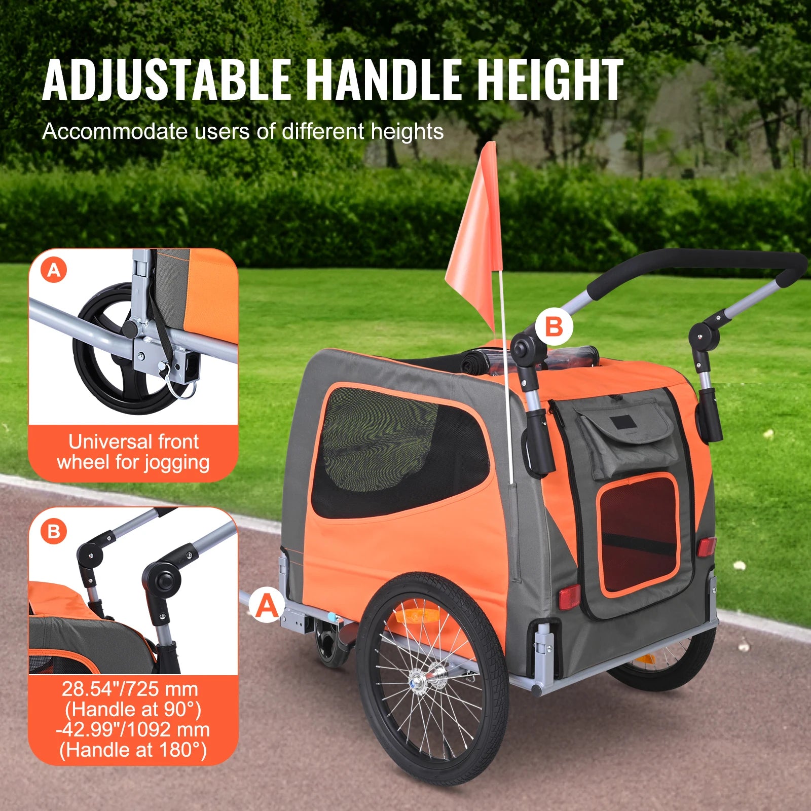 Adjustable Handle Height: The handle of our pet bike carrier is height-adjustable, ranging from 28.54"/725 mm (at a 90° angle) to 42.99"/1092 mm (at a 180° angle). It's designed to accommodate individuals of varying heights. Whether you're a tall rider or on the shorter side, we've got you covered.